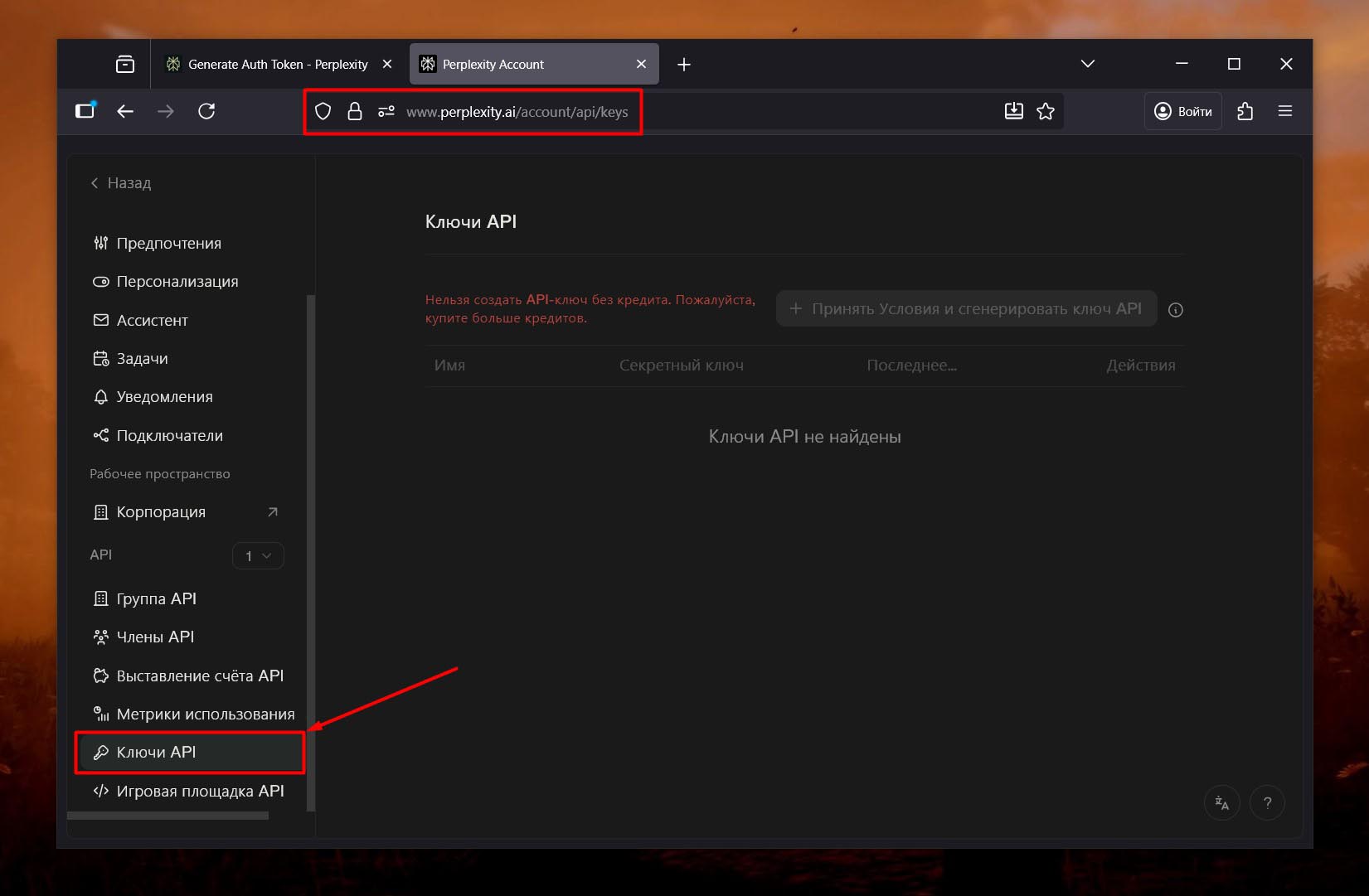 - В дашборде Perplexity выберите сервис и авторизуйтесь.