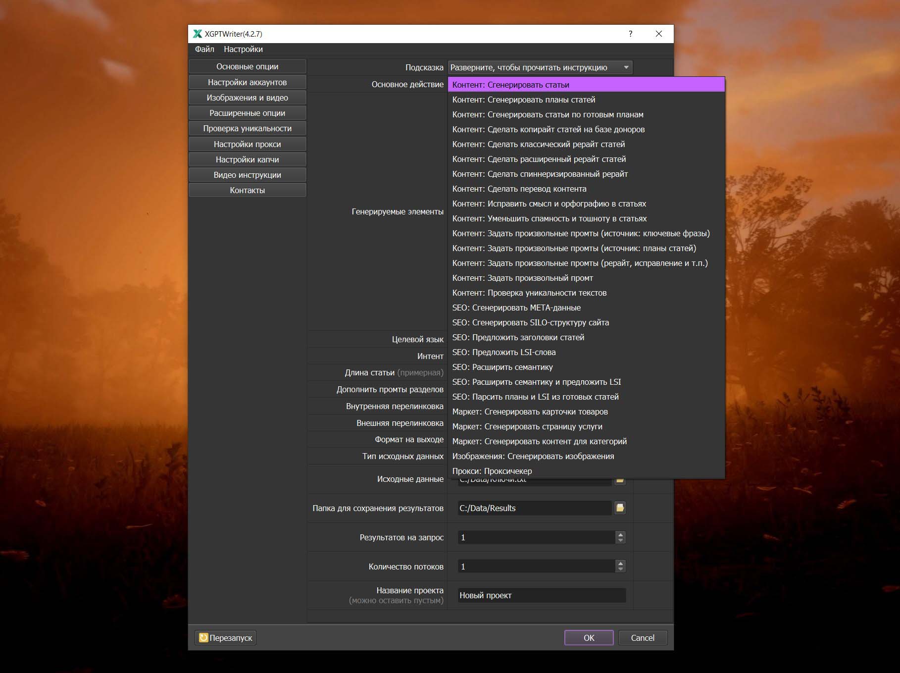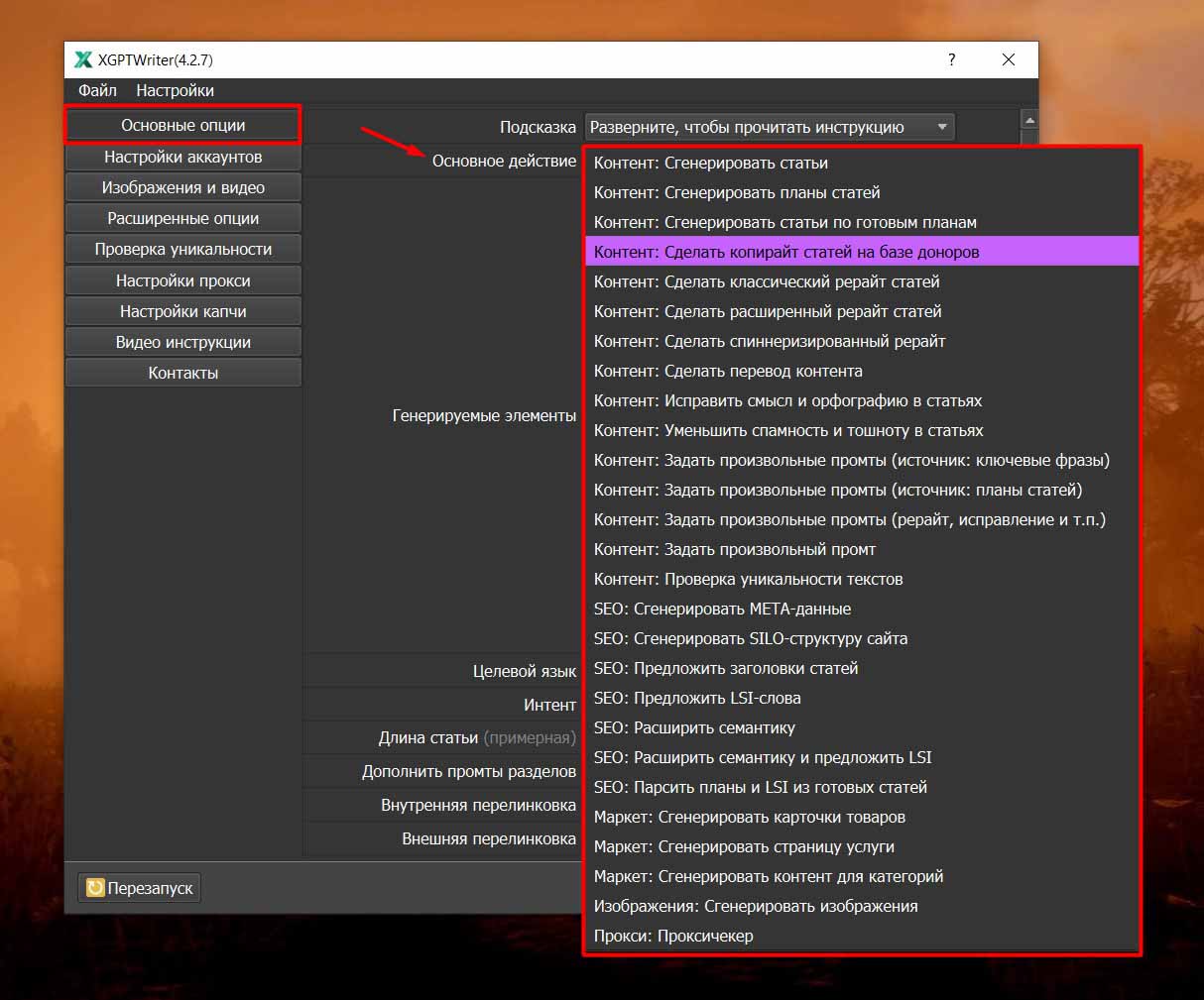 - Определение типа контента: Выберите, что генерировать: статьи, переводы, отзывы или карточки товаров. Для примера - "Сделать копирайт статей на базе доноров".