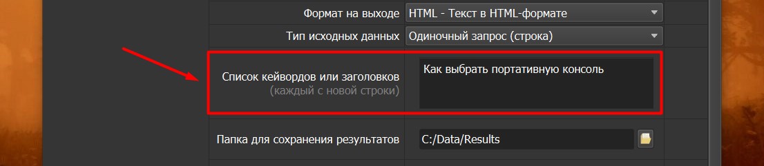 - Ввод ключевых слов: Укажите ключевые слова (например, "как выбрать портативную консоль") напрямую или из файла. Для SEO добавьте семантически связанные термины (LSI).