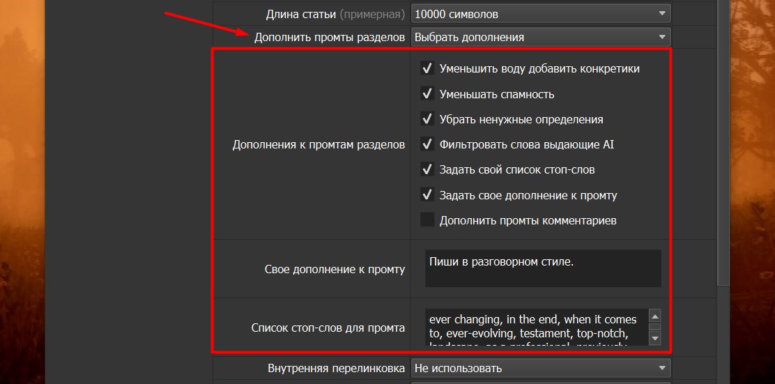 - Кастомный режим: Настройте промпты для элементов статьи вручную.