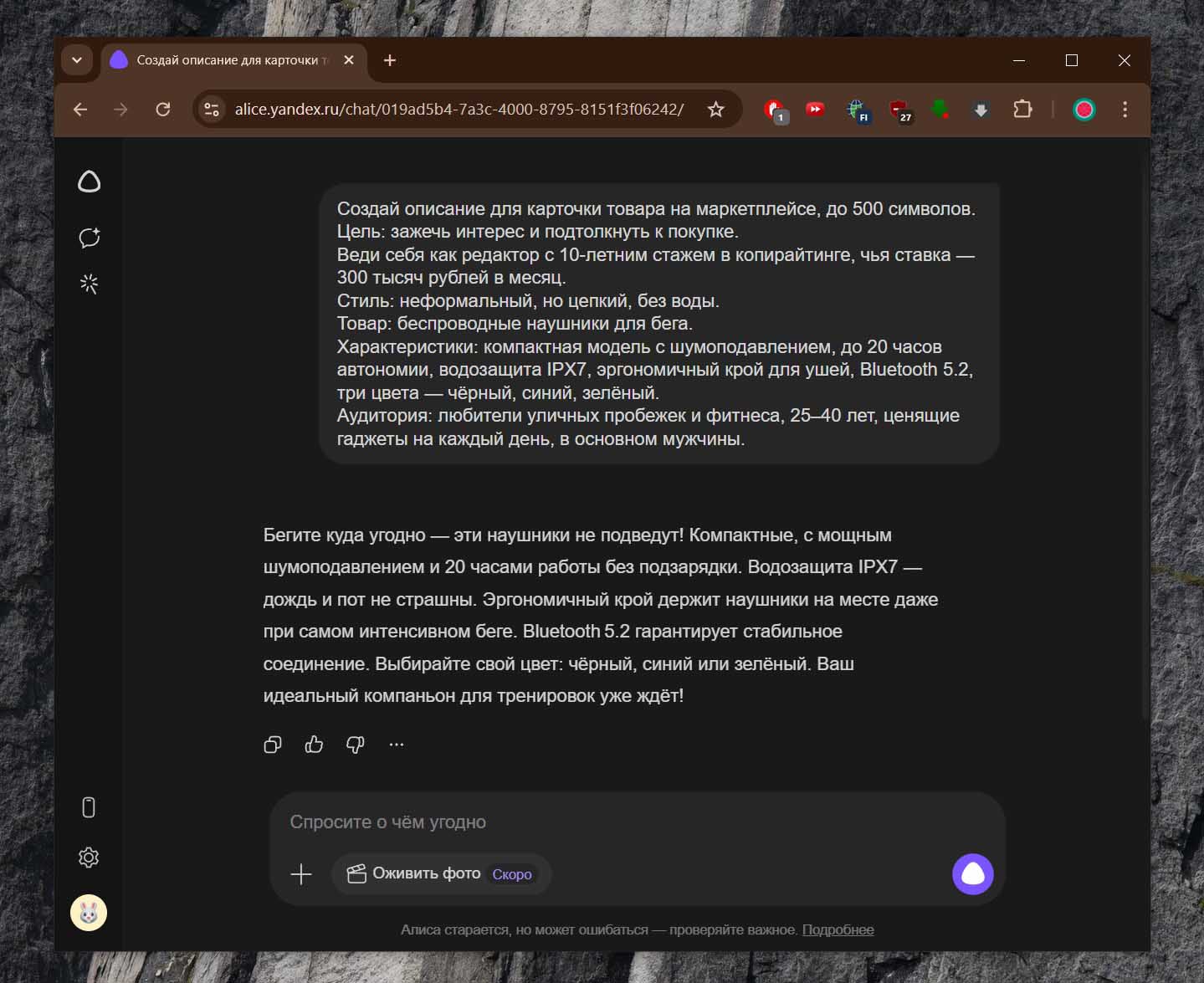 Мы взяли семь самых актуальных моделей 2025 года и прогнали их через один и тот же жёсткий тест: описание карточки товара для маркетплейса (до 500 символов, неформальный стиль, цепляющий призыв, все характеристики на месте). Задание одинаковое для всех - никаких поблажек.