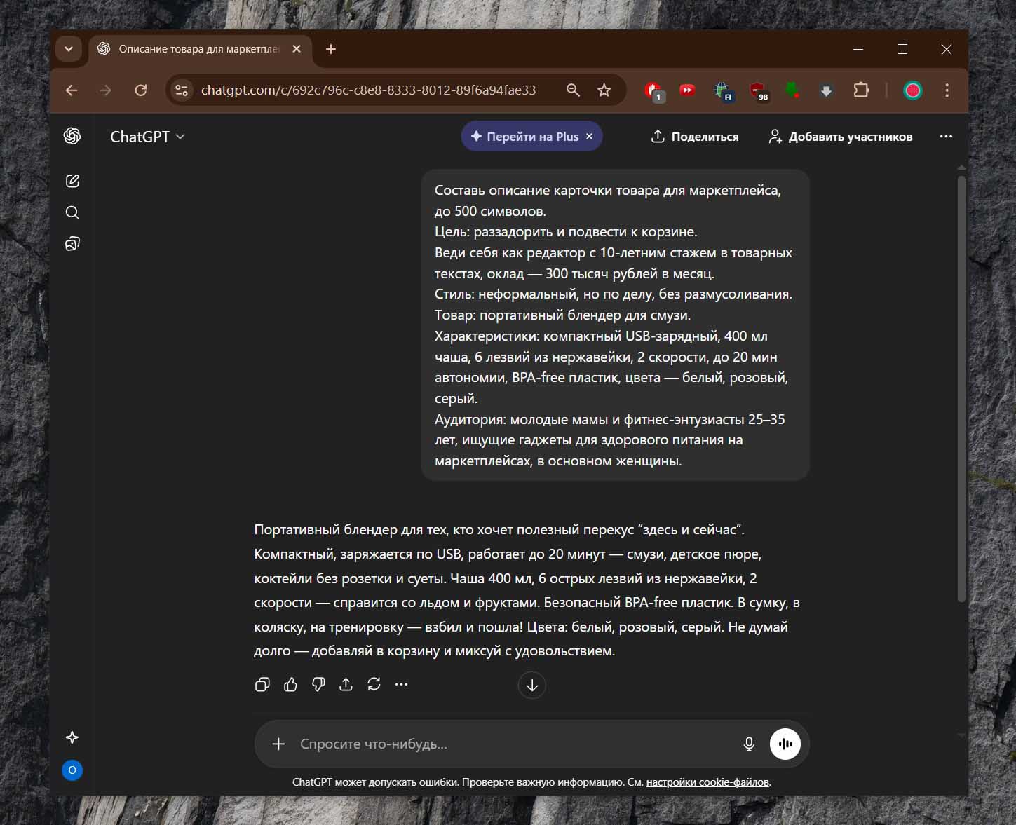 Текст получился живым и убедительным - сразу передаёт динамику "взбил и пошёл", с акцентом на практичность для мам и фитнеса, все характеристики на месте, включая цвета и безопасность. Неформальный тон мотивирует без нажима, без ошибок или воды, но для карточки маркетплейса можно было бы добавить пару строк о цене или бонусах. В целом, солидный результат: готов к публикации, с лёгким шармом повседневности. В X-GPTWriter при массовой генерации (сотни карточек) ChatGPT держит стабильную уникальность и стиль - без провалов и шаблонности.