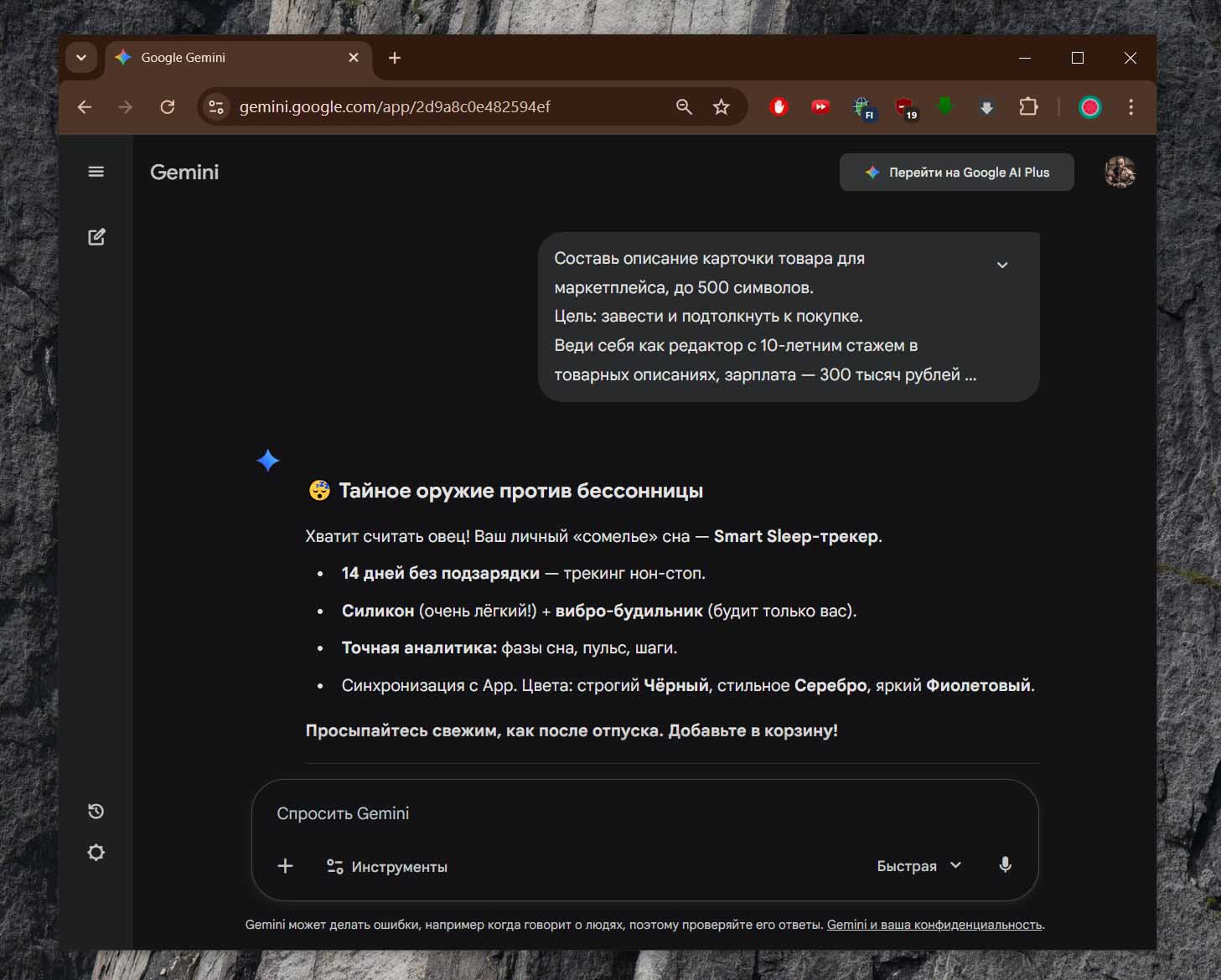 Gemini - всесторонний инструмент для текстов любой сложности: от черновиков до финальных версий с вариантами под запрос. Без платформы она ищет инфу, сравнивает факты, готовит темы для статей, переводит, рерайтит и даже превращает фото в нарратив. Загружай файлы или говори голосом - лимиты на бесплатке мягкие, но для глубины бери подписку; слабость в региональных блоках (VPN must-have для РФ) и этических барьерах, где рискованные промпты отсекаются, а изображения генерирует базово, без изысков.