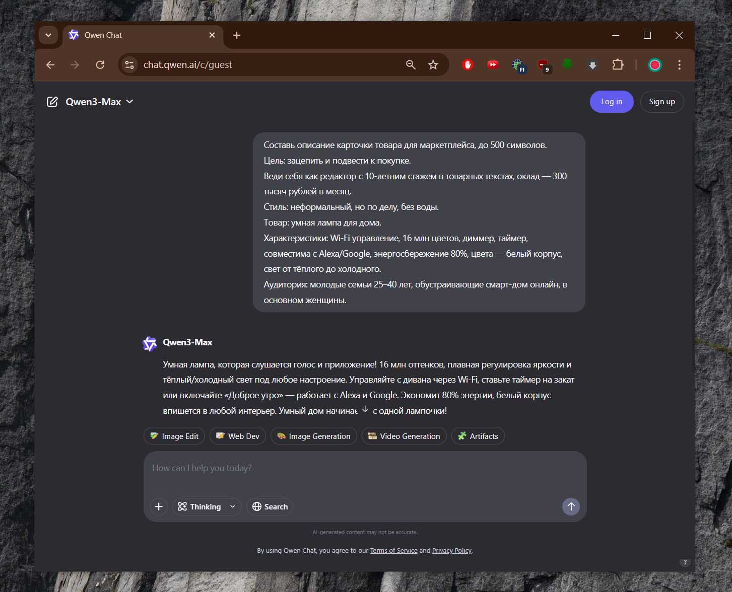 Через API Qwen3 открывает базовый функционал без лишних шагов: генерирует тексты, ищет паттерны в данных, переводит документы и проверяет код на баги - всё в одном вызове. Лимиты по токенам гибкие (зависит от плана), но для free-тестов хватит на пробу; слабости в UI-отсутствии (только код), загрузке файлов через payload и фильтрах на sensitive-контент, где модель осторожничает, - идеал для devs, но не для новичков без API-опыта.