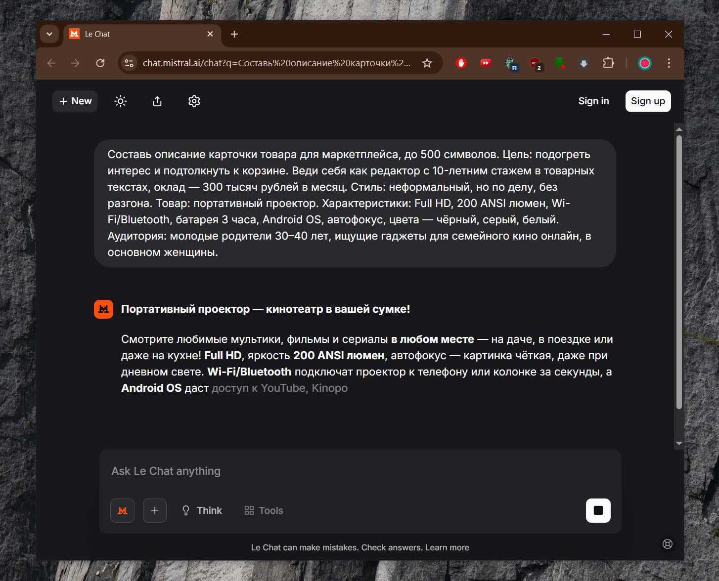 Текст вышел компактным и семейным - сразу рисует вечер с мультиком на стене, все фичи вроде автофокуса и батареи на виду, тон мотивирует "включи и наслаждайся". Стиль неформальный, без ошибок, цвета упомянуты ровно; минус - можно было добавить цену для urgency, но для карточки это солидно, с лёгким теплом. В X-GPTWriter при массовой генерации Mistral - чемпион по цене/качеству: быстро, дешево, уникальность на уровне.